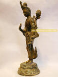 This 12” Padmapani Lokiteshvara is standing and holds stalk of lotus in his left hand. The right hand, opening outward, is lowered in a gesture of granting favors, which also indicates his readiness to help. Draped over his left shoulder is the skin of a wild deer renowned for its compassionate nature. Among the many forms of Avalokiteshvara, this two – armed, single – faced form called Padmapani which is probably the oldest. Avalokiteshvara is the embodiment of all the Buddha’s infinite compassion.