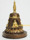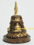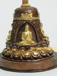 Partially Gold Gilded 6.5” Stupa or Chorten made from Copper is beautifully carved with beautiful carvings and has figures of Dhyani Buddha around the Stupa or Chorten. |